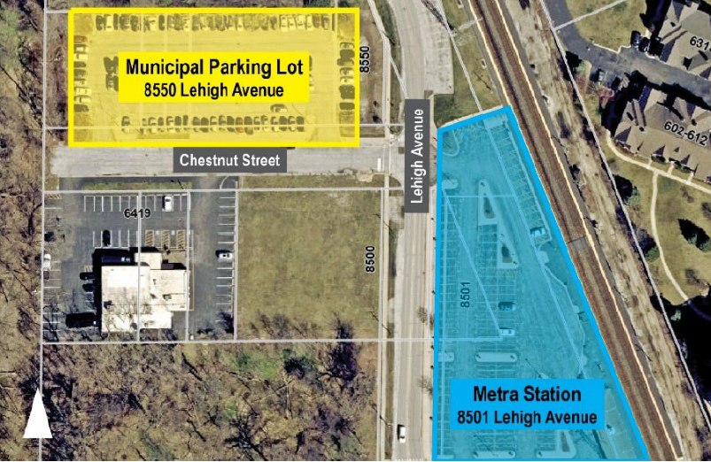 The parking lot is located at 8550 Lehigh Avenue. The property is to the northwest of the Metra Station on the north side of Chestnut Street and west of Lehigh Avenue. The parking lot is accessed by Chestnut Street.
